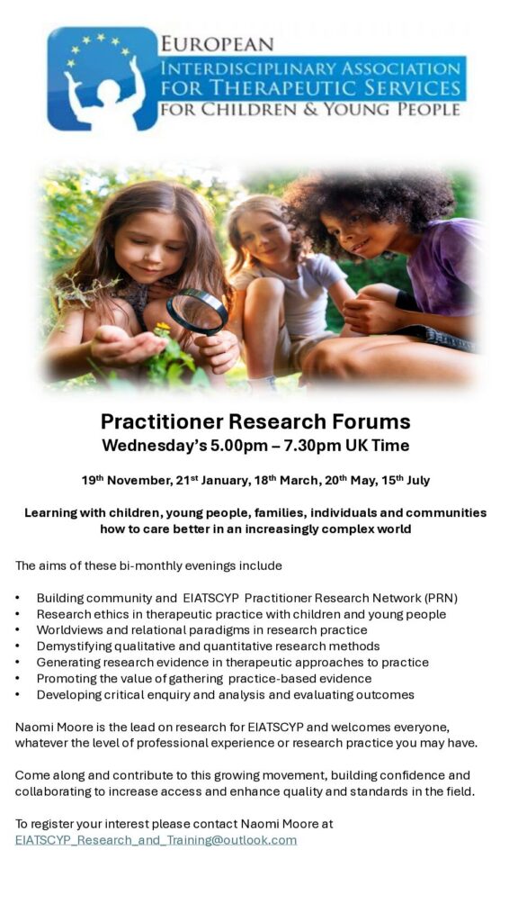 Practitioner Research Forums are bi-monthly evening online sessions (Wednesdays, 17:00–19:30 UK time) led by EIATSCYP.